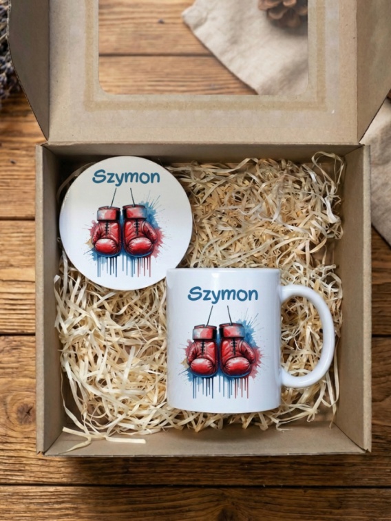 Zestaw prezentowy dla boksera - kubek i podkładka z dowolnym imieniem